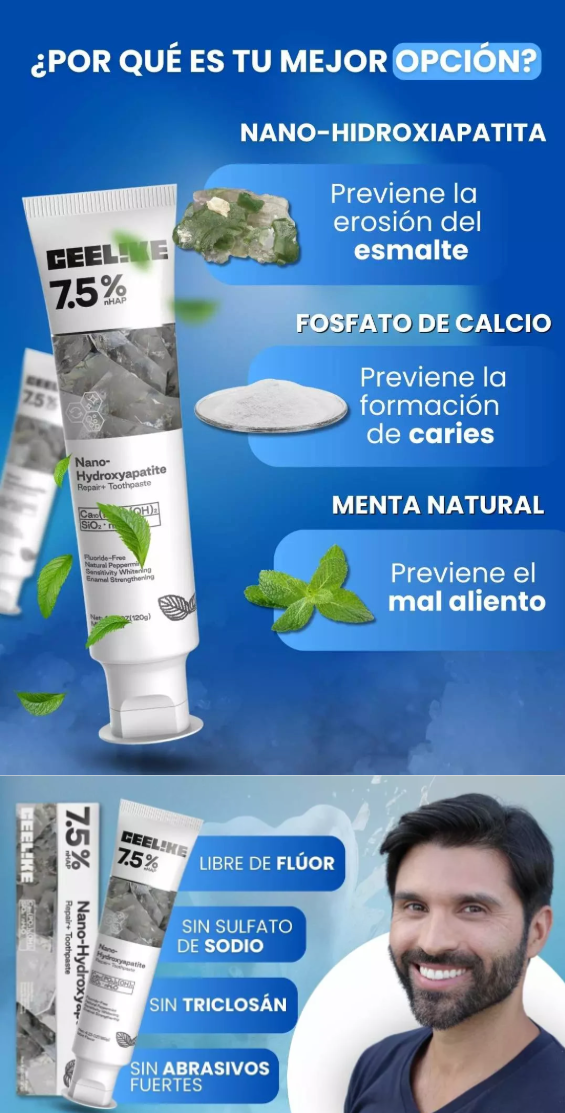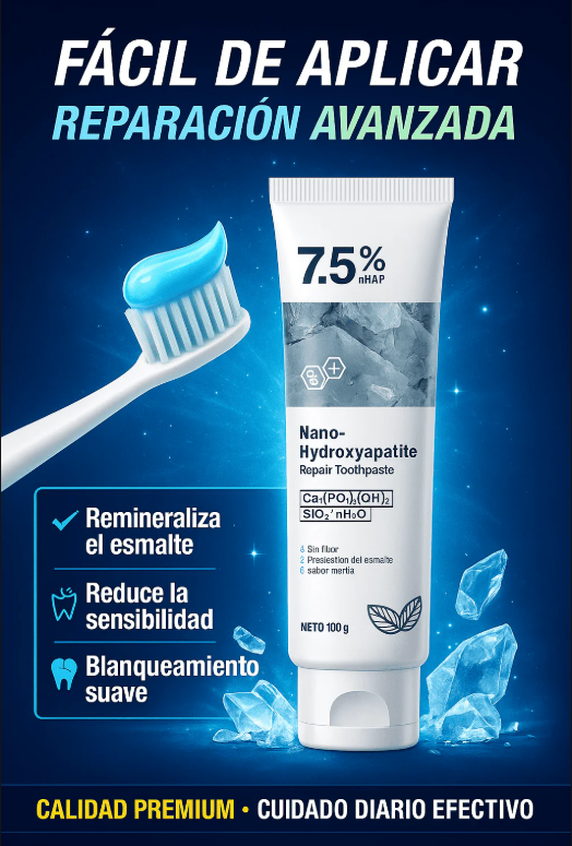 Sí. La nano-hidroxiapatita es un mineral presente de forma natural en los dientes. Ayuda a remineralizar el esmalte, rellenar microfisuras y fortalecer los dientes con el uso continuo, sin flúor.